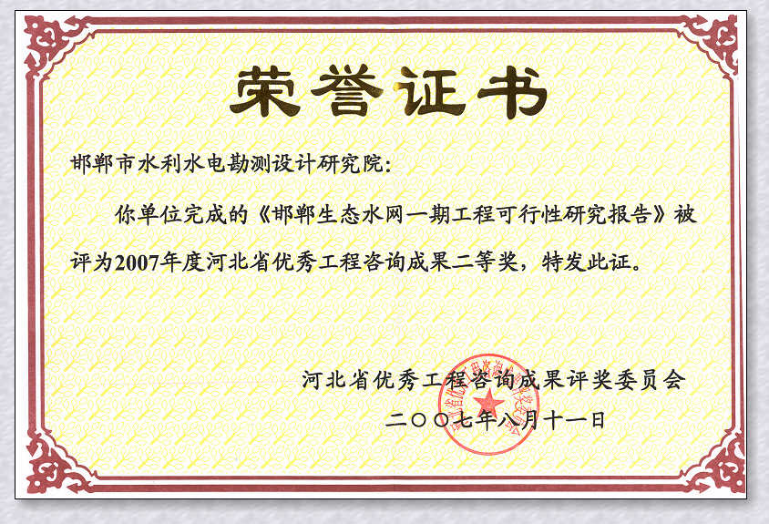 《邯鄲生態(tài)水網(wǎng)一期工程可行性報告》被評為河北省優(yōu)秀咨詢成果二等獎